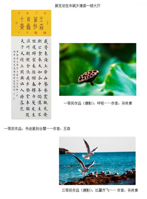 海川集團員工在海川書畫攝影研究會的牽頭下積極參與此次展覽,創(chuàng)作精力充沛,在短短一周內創(chuàng)作作品數(shù)十幅。展覽期間,主辦單位共收到各類參展作品294幅,其中:書法類作品83幅,繪畫類作品65幅,攝影類作品139幅,手工才藝類作品7件。在此次展覽中海川集團員工周天馬、丁磊、孫良青、楊興強、寧楊、王森的作品入展并在市城鄉(xiāng)建委一樓大廳展出。這些作品主題鮮明、風格多樣。在展覽后評獎中,孫良青攝影作品《呼吸》獲攝影作品一等獎,《比翼齊飛》獲三等獎;王森《書法篆刻合璧》獲書法類一等獎。