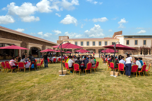 參觀山莊的過程中,與會(huì)嘉賓著重參觀了釀酒廠及酒窖。九頂莊園出產(chǎn)的所有葡萄酒均采用法國(guó)傳統(tǒng)工藝,輔以最新現(xiàn)代技術(shù)釀造而成。隨山勢(shì)自然傾斜而建的釀酒廠,能夠在采摘過程中保持葡萄果實(shí)的最佳品質(zhì)。酒廠建于山石之中,于山頂接收果實(shí),并讓其自然落入下方的發(fā)酵室內(nèi)。
